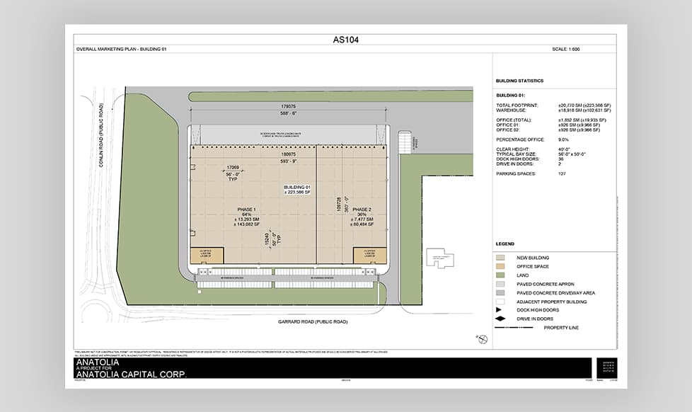 4605 Garrard Road Building 1 represents the inaugural phase of Anatolia's visionary development project, comprising three industrial buildings set to occupy Anatolia's expansive land parcel at 4605 Garrard and 975 Conlin Road, spanning an impressive 102.73 acres in Whitby, Ontario, Canada. This prime land asset boasts a strategic location and abundant potential for development, offering a canvas ripe for transformation into a remarkable venture.