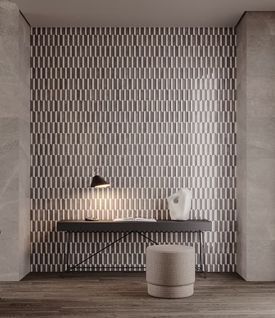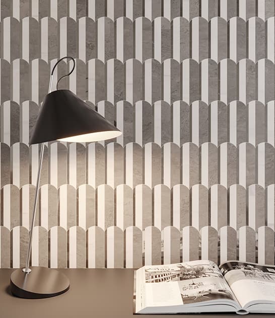 Constante y reconfortante. El diseño cíclico del mosaico Hydros refleja el flujo y reflujo de la marea. Las tonalidades distribuidas a intervalos fijos inspiran calma y previsibilidad.