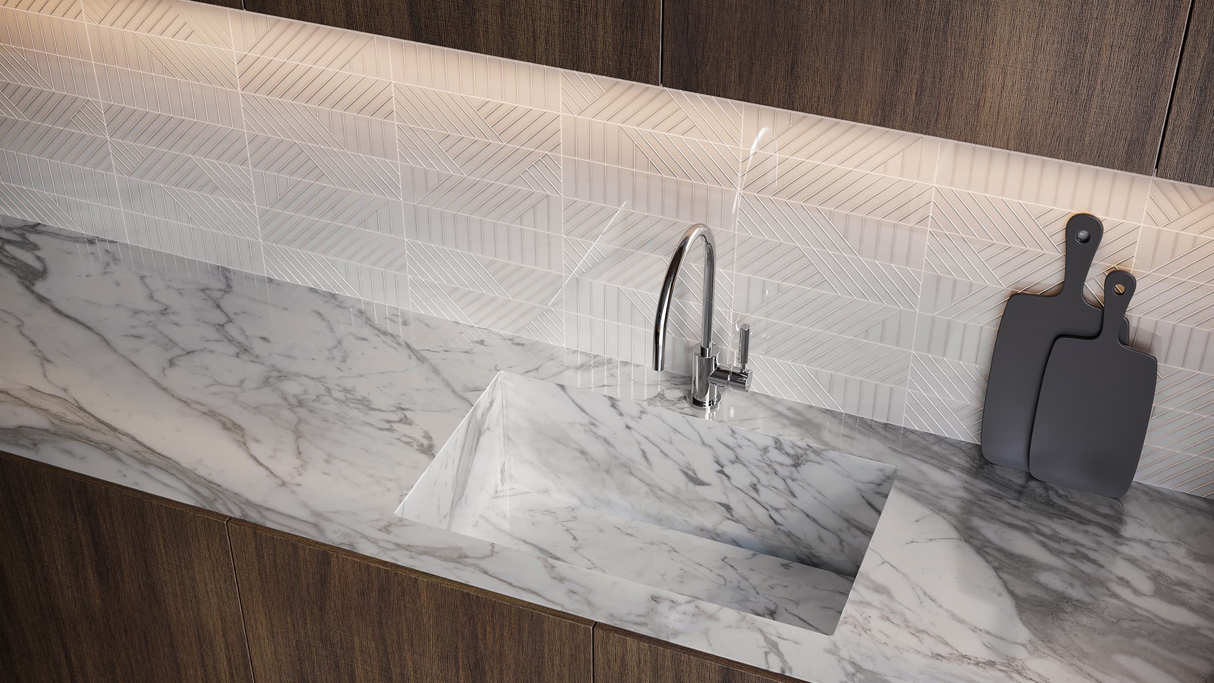 Un îlot expressif en Calacatta Corchia, animé par des veines noires dentelées, transforme le plan de travail en une source texturale intrigante, complétant la glaçure blanche de Geometra et les motifs striés d’inspiration contemporaine sur le mur du fond. L’audace de la dalle de pierre frittée rappelle la beauté stratifiée des falaises du littoral, conciliant le charme sauvage du bord de mer avec des éléments de design élaborés.