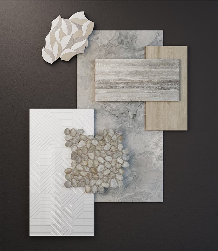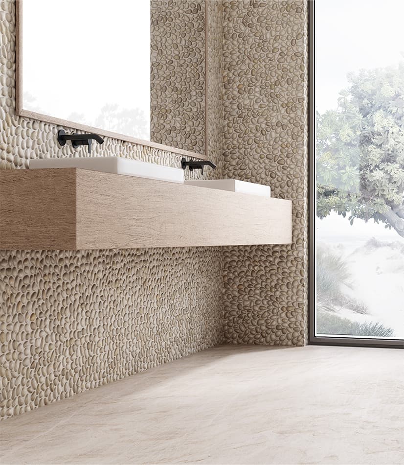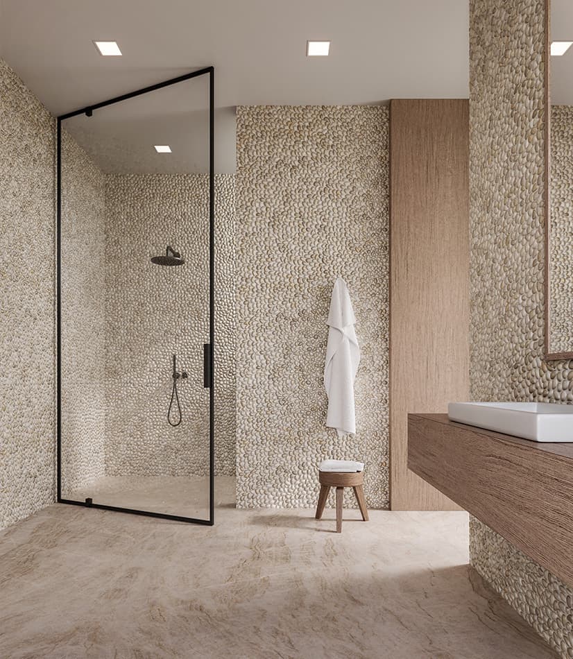 Comme si elle avait été cueillie sur le rivage, la gamme élémentaire de mosaïques de galets de la collection Zen évoque la tranquillité du littoral. Adaptés aux salles de méditation, aux terrasses et aux salles de bains, la surface lisse et les dégradés naturels font écho au rythme des vagues qui caressent le rivage. Superbement associée à la dalle en pierre frittée Taj Mahal, dont la texture striée et éthérée capture la polyvalence des espaces aux tonalités monochromes et neutres.
